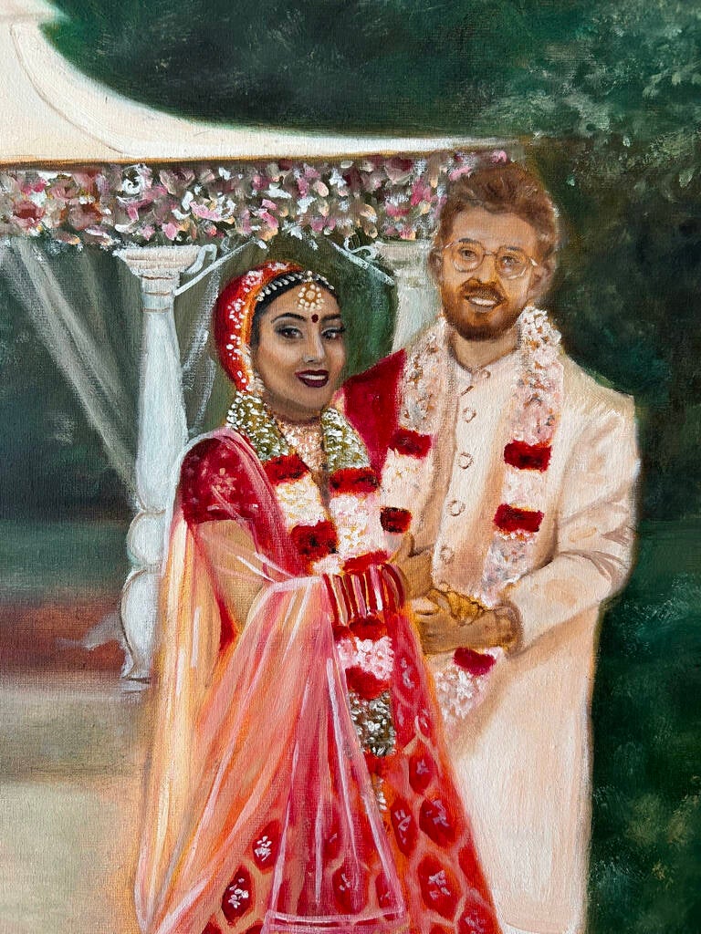 After the wedding, I continued the touch ups of the oil panting of the couple. I added in the special details, like the beautiful gold embroidery on her lehenga and the greenery of the formal stately gardens around them. When the oil painting was dry, I varnished it to ensure that the piece will last a lifetime at the highest quality, and to give it a deep and lustrous finish.